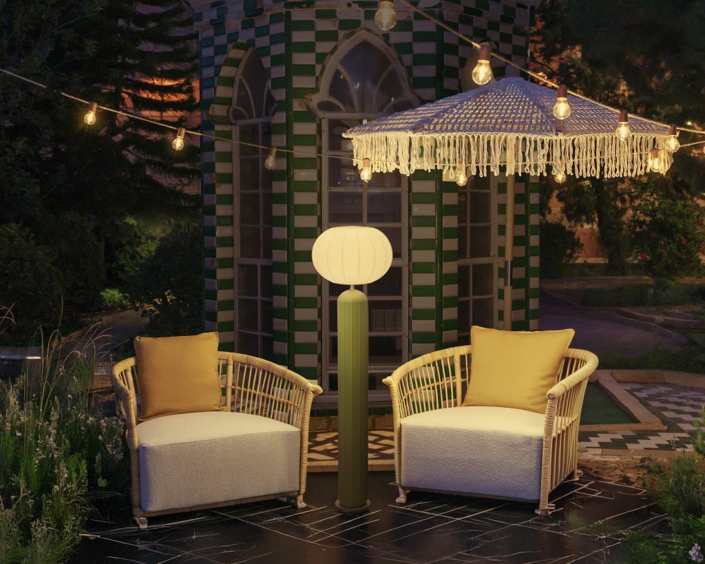 Monica, en cambio, se define por el equilibrio. Su pantalla esférica y su silueta limpia transmiten orden, armonía y claridad visual. Es la más estructurada de la colección, aquella que aporta estabilidad estética al conjunto. Como en la serie, Monica representa la idea de cuidado por el detalle, de espacios pensados para funcionar, pero también para acoger. Su diseño minimalista la convierte en una pieza atemporal que encaja tanto en terrazas modernas como en jardines más clásicos.