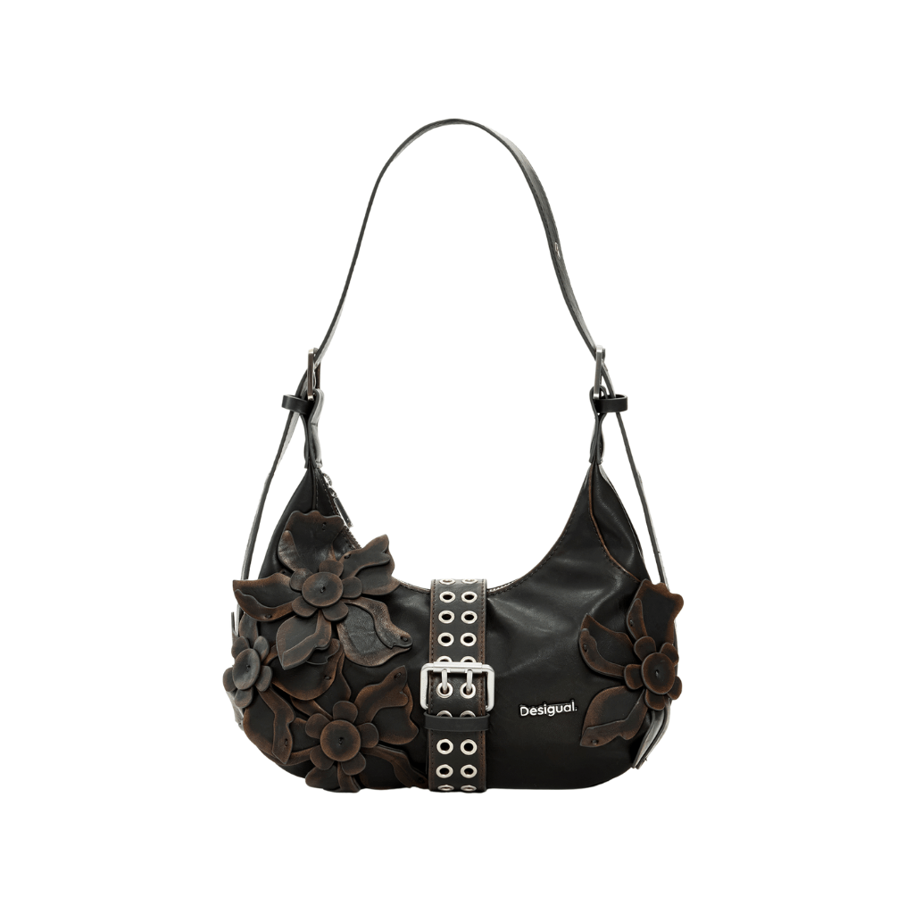 El toque final lo pone un bolso pequeño con asa extensible, apliques florales y correa con hebilla decorativa, que añade un contrapunto artesanal y femenino al look. La combinación de archivo, tendencia y actitud urbana demuestra, una vez más, la capacidad de Desigual para reinterpretar sus códigos más icónicos en clave contemporánea, algo que ha convertido a la marca en un referente de estilo internacional.