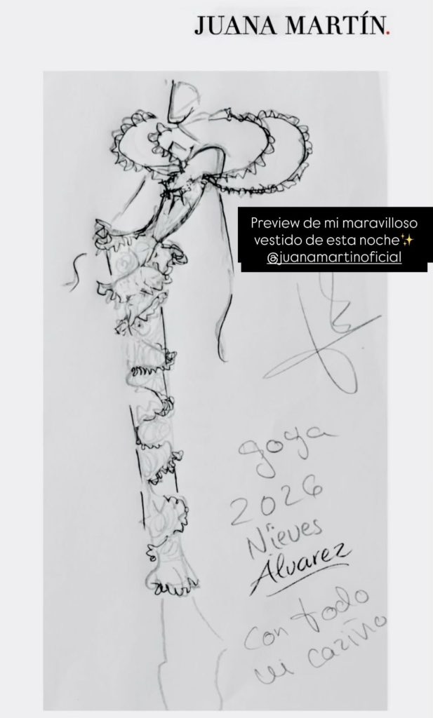 Figurín del diseño de Juana Martín x Nieves Álvarez y el vestido a horas de los Premios Goya 2026 | Instagram